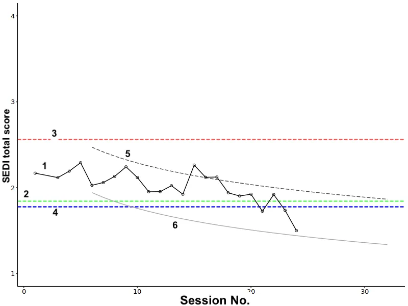 Typical feedback graph showing the course of a brief symptom scale measured before therapy sessions. 1: observed symptom score, 2: cut-off value for clinically meaningful improvement, 3: cut-off value for deterioration, 4: cut-off value for remission, 5: individual failure boundary, 6: expected course of symptoms.
