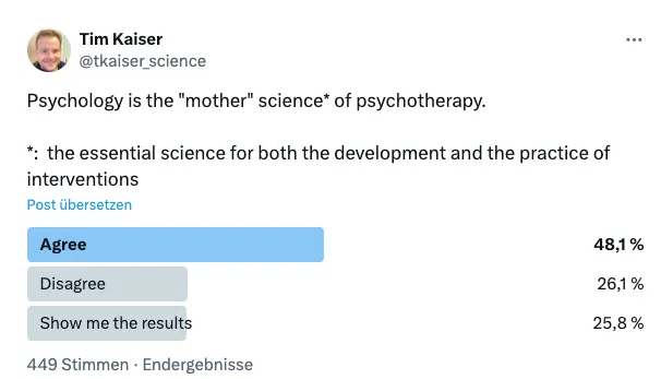 A while ago, I started a Twitter survey on whether psychology is the “mother science” of psychotherapy. Roughly two-thirds agreed with the statement I thought would be uncontroversial. As an academic psychologist, I was strongly convinced about the “mother science” take. I still am. But I noticed that there are two opposing positions on this matter and that some nuance on this topic could be helpful.
